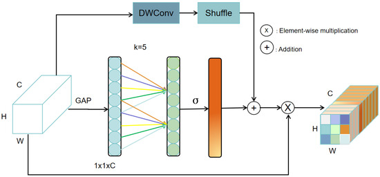 The ESA structure is illustrated in Figure 2. The input is received from the upper layer and contains the channel and spatial details of the image. Subsequently, the input is subjected to global average pooling to compress the spatial dimension information into global features at the channel level, where the kernel size of the convolution is computed using a formula, and the feature map is obtained using the one-dimensional convolution kernel. At the same time, the input is adjusted through the branch of depthwise separable convolution and shuffle to improve the information flow between different channel groups, encourage inter-feature cross-learning, magnify the model’s representational abilities, and perform a summation operation for the two acquired features to gain a richer feature representation. Finally, the fused features of the two branches are multiplied element-by-element to avoid information loss during the series of operations.