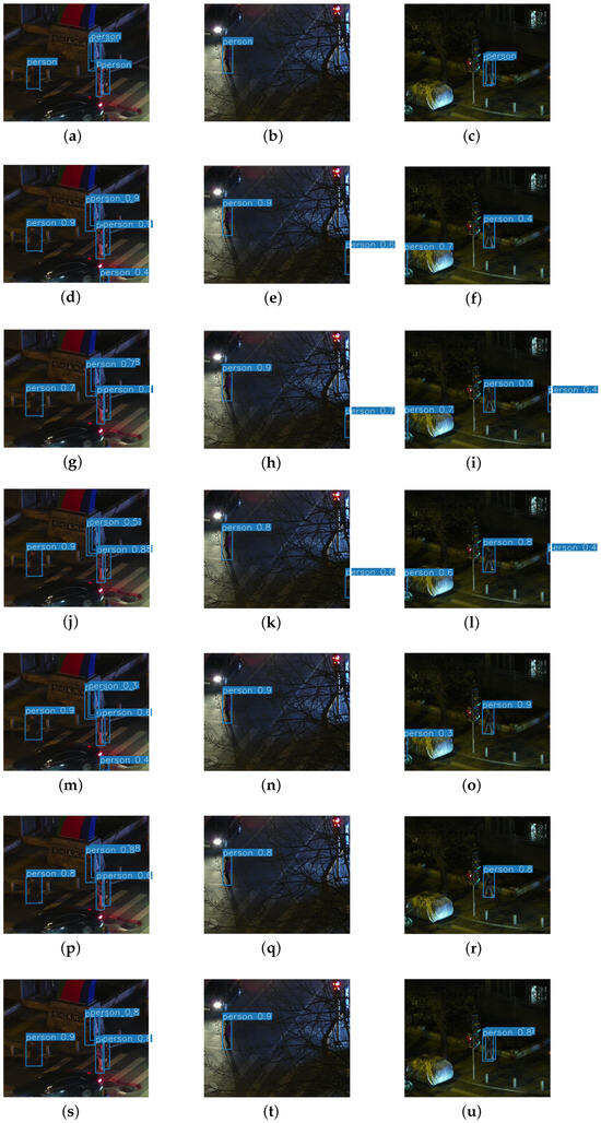 Comparison of multimodal detection effects for different algorithms using the LLVIP dataset. (a) Ground truth, (b) ground truth, (c) ground truth, (d) YOLOv3, (e) YOLOv3, (f) YOLOv3, (g) YOLOv4, (h) YOLOv4, (i) YOLOv4, (j) YOLOv5s, (k) YOLOv5s, (l) YOLOv5s, (m) YOLOrs, (n) YOLOrs, (o) YOLOrs, (p) SuperYOLO, (q) SuperYOLO, (r) SuperYOLO, (s) ACDF-YOLO, (t) ACDF-YOLO, (u) ACDF-YOLO.