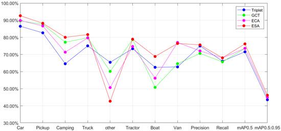 The performance of various attention mechanisms was compared and analyzed by examining the AP value, precision, recall, and mAP value. Triplet attention considers both spatial and channel dimensions, instead of limiting itself to feature weighting in a single dimension, which theoretically bolsters the model’s ability to gather important information. However, based on our experimental results, triplet attention did not show the expected benefits in the context of this study. In contrast, GCT utilizes a Gaussian context converter to directly map global environmental information onto attentional activation, which is unique, in that it achieves significant feature reinforcement without using a learning process [46]. In the theoretical analysis, GCT was expected to provide more effective feature fusion, but the experimental results did not support this. Line graphs of the different attention mechanisms are shown in Figure 7, revealing their relative performance across the various categories of detection and evaluation metrics. Although triplet attention and GCT performed well for some aspects, our proposed ESA mechanism achieved an optimal performance for most categories and key detection evaluation metrics. Notably, under the more stringent detection threshold requirements, the ESA mechanism still provided a significant performance improvement, further validating its effectiveness and reliability.