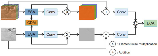 Various attentional mechanisms have been demonstrated in the investigation of multimodal fusion, considering the ease of operation, as well as effectiveness. Prior to feature fusion, we incorporate our ESA mechanism into the respective branches of the two modalities. We note the advantage of ECA in improving the model’s capability to depict the channel dimension. ECA empowers the model to concentrate on key channel characteristics by dynamically adjusting the channel’s dimensions, enhancing both its representational efficiency and performance. Moreover, we considered that the ECA mechanism, although it is lightweight, requires some additional parameters to learn the attention weights between channels. Therefore, we modified it to obtain the ESA mechanism.