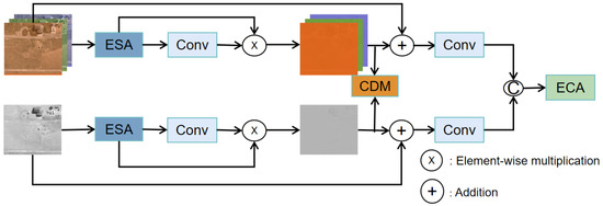 In the fusion phase, we use the designed ACDF module, which amalgamates two principal segments: an attention section and a CDM. After the visible and infrared images are input, they are preprocessed by the ESA mechanism, then multiplied element-by-element with the result of the convolutional processing, followed by residual concatenation to preserve the preliminary information. Subsequently, this information is fed into the CDM to further emphasize inter-modal differences, and the attention given to local features is enhanced by performing stitching operations in combination with the ECA mechanism. Through this series of operations, we obtain deeply fused and improved features. It is possible to depict the entire procedure using Equations (1)–(3), where denotes the features obtained from the visible image after branching, denotes the features of the infrared image after branching, and denotes the fused features.
