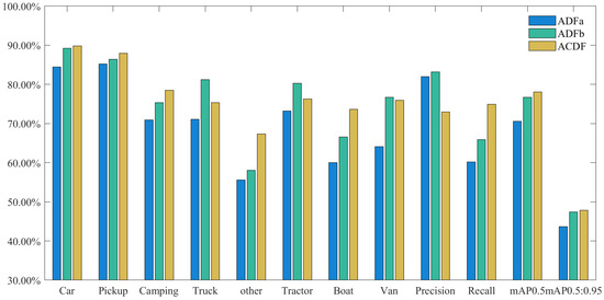 We found that ADFb outperformed ADFa and the ACDF module in the detection task for specific categories (e.g., Truck, Tractor, and Van). However, even though method ADFb led in detection accuracy for certain categories, its overall recall was relatively low, implying that it may have a high misdetection rate in practical applications. Considering that a low recall can severely limit the usability of a model in real-world scenarios, we attempted to find a balance where a relatively high recall can be maintained, while ensuring a high detection precision.