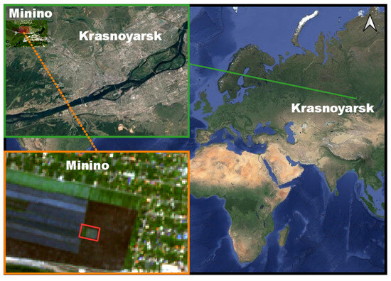 A wheat field during the heading–ripening period was chosen as a test site (an area of several hectares). The field was located on the territory of the Experimental Production Farm “Minino” of the Federal Research Center KSC SB RAS, located in the area of the Minino village, Emelyanov district, Krasnoyarsk region, in the Russian Federation (56.0641N, 92.6976E). The test field was randomly sown with four kinds of wheat: Krasnoyarskaya no. 12, Beyskaya (osistaya), and Novosibirskaya no. 31 and no. 15. The location of the test field is shown in Figure 1.
