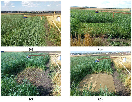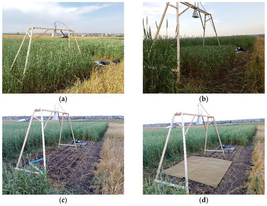 (a–d) The process used in the experiment on the remote sensing of the wheat canopy in the MHz-frequency range with an OKO-3 GPR (23 August 2023); (d) measurement over a metal screen. Free space calibration is not shown.