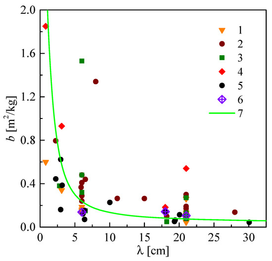 Lambda dependency of the b-factors: 1—corn [64,65], 2—soybean [64,65,66,67], 3—wheat [64,65], 4—alfalfa [64,65], 5—wheat grains [60], 6—cereals, and sorghum [66] are brad-factors, estimated based on radiometric measurements, and the 7–brefr-factor, calculated based on the refractive mixing model (4).