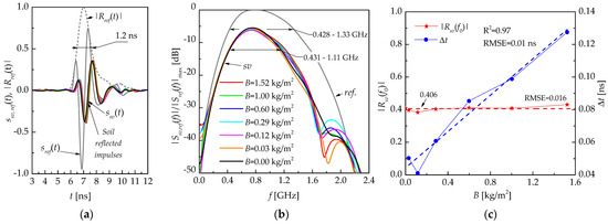 (a) Time shapes of the GPR impulse MHz-frequency range, reflected from the vegetation–soil cover ssv(t) (color lines) and metal reflector sref(t) (gray solid line), with the normalized envelope of impulse, reflected from the metal screen |Rref(t)|= (gray dashed line); (b) the corresponding normalized module of the impulse spectrum |Ssv,ref(f)|; (c) the module of the reflection coefficient |Rsv(f0)| and the delay time Δt (calculated from the maximum envelopes) of GPR impulses (see Figure 6a), depending on the measured fresh AGB value calculated by the thermostat-weight method.