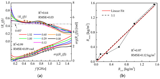 (a) The measured (solid lines) and retrieved (dash lines) modules and arguments of the spectrum of reflection coefficients; (b) the correlation between measured and retrieved fresh AGB values. The optimally found parameters while solving the inverse problem (6) were Wretr = 23.4 ± 2.6% and σr,retr= 1.4 ± 0.3 cm. The color scheme of solid and dashed color lines is the same (various colors of lines correspond to the different values for fresh AGB in [kg/m2]).