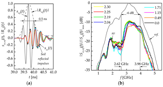 During the experiment on 3 September 2023, an impulse with a duration of ΔτGHz = 0.5 ns (at a 0.5 level of the maximum envelope, see Figure 8a) with a bandwidth of 1.36 GHz (at a level of −6 dB, from 2.62 GHz to 3.98 GHz) and 2.16 GHz (at a level of −10 dB, from 2.02 GHz to 4.18 GHz), with an average frequency of 3.2 GHz (see Figure 8b) was used for the remote sensing of the wheat canopy at another test plot. The normalized time shape sref(t) and envelope of the GPR impulse, reflected from a metal screen (brass mesh 2 × 2 m), is shown in Figure 8a (see the solid and dashed gray curves, respectively). The timeline in Figure 8a starts from 39.0 ns for analyzing the impulses reflected from the soil surface. In accordance with the methodology, the amplitude of the impulses reflected from the vegetation–soil cover was calibrated by normalizing to the maximum envelope of the impulse, as reflected from the metal screen . The measured time shapes of the impulses are shown in Figure 8a (see colored curves) as the wheat cut down layer by layer from the top to the soil surface. The normalized impulse spectra, reflected from the metal screen |Sref(f)| and from the vegetation–soil cover |Ssv(f)|, are shown in Figure 8b.