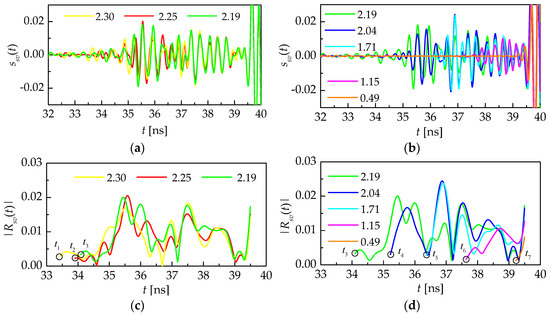 (a,b) Normalized time shapes of impulse ssv(t), reflected from the vegetation–soil cover and (c,d) their envelopes as wheat is cut down from the top to the soil surface. In the legend, the numbers indicate fresh AGB in [kg/m2], measured in situ by the thermostat–weight method. The key for the black circles will be made clear further on.