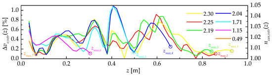 As a result, based on Equations (8)–(10) and the data shown in Figure 9c,d, the values of ncan,retr(z) and Δvv,retr(z) can be calculated (Figure 10).