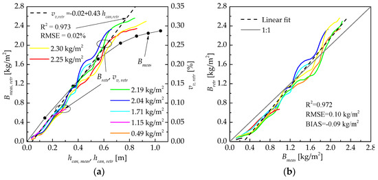 (a) The retrieved Bretr (color lines) and measured Bmeas (line with black circles) for fresh AGB, depending on the retrieved hcan,retr and measured hcan,meas canopy heights, respectively; (b) correlation between the retrieved and measured fresh AGB values.