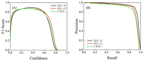 As shown in Table 2, the YOLO v8 model achieved the highest scores in precision, recall, F1 score, and mAP@0.5 when compared horizontally with the two typical object detection models: YOLO v5 and Faster R-CNN. In Figure 6, the F1–confidence curve and precision–recall curve for each object detection model are shown. It can be seen from the figure that the YOLO v8 model achieved the highest F1 score and had better precision at all recall rates compared to the other two models. In summary, the YOLO v8 model achieved the best training accuracy on the custom dataset used in this study.