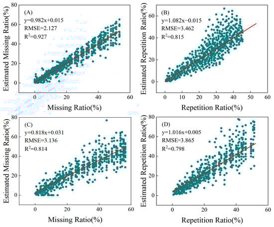 Scatter plots of the Voronoi method estimates versus simulated values. (A) Missing seedling rate. (B) Repeated seedling rate. (C) Missing seedling rate scatter plot when both missing and repeated seedlings are present, with a 10% repeated seedling rate. (D) Repeated seedling rate scatter plot when both missing and repeated seedlings are present, with a 10% missing seedling rate.
