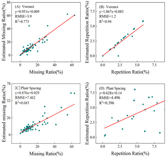 This study uses RMSE and R2 to evaluate the accuracy of the Voronoi method for estimating the missing seedling rate and repeated seedling rate. The formulas are shown in Equations (17) and (18) [36].