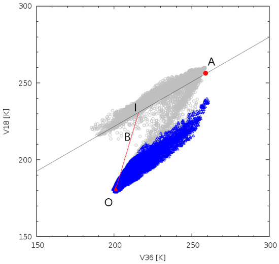 Schematic of the AMSR-E bootstrap algorithm. Gray circles represent sea ice areas and blue triangles correspond to open water areas or <10% sea ice concentration (SIC). The thin solid line is the SIC 100% line. The red triangle (O) is the open water tie-point (SIC 0% point), and the red circle is the SIC 100% point (point A). Point B is one of the observation points. Point I is the intersection of the SIC 100% line and the extension of the OB line. The SIC at point B is the ratio of OB to OI.