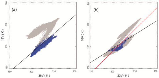 Open Ocean mask lines for SSM/I. Blue points correspond to ice-free or less than 10% SIC and those in gray correspond to SIC 0–100% data (all valid data). Scatter plots for (a) 36 V versus 18 V (36 V 18 V). The black line in (a) is the open ocean mask line for 36 V 18 V. Scatter plots for (b) 23 V against 18 V (black line) and difference in thresholds of 23 V and 18 V (red line). The black line for 23 V 18 V in (b) is the regression line of the residual blue points over the 36 V 18 V line. The red line at 23 V 18 V has a slope of 1.0.