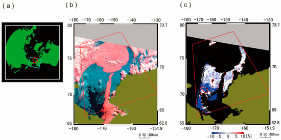 Comparison of the AMSR-E and MODIS SICs. The AMSR-E SIC was validated using the Aqua/MODIS sea ice/cloud flag (MYD29) throughout the Northern and Southern Hemispheres. The figure represents a sample of the validated area. (a) Validation area map (26 June 2006, 14:10 UTC). (b) Aqua/MODIS RGB (R: 7 ch G: 2 ch B: 1 ch). Pink and white are clouds, blue is sea ice, black is open water, and gray is no observation. (c) SIC differences between AMSR-E and MODIS (AMSR-E minus MODIS equals difference). To validate the AMSR-E SIC, clear-sky pixels (80% cloud-free) were selected. MODIS SIC was derived as a fraction of the MYD29 sea ice flag (spatial resolution of 1 km) within the AMSR-E footprint size (14.4 × 8.2 km).