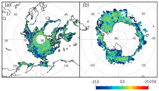 Differences in the SIC between AMSR-E and MODIS (AMSR-E minus MODIS equals difference) were plotted in the (a) Northern and (b) Southern Hemispheres in 2006.