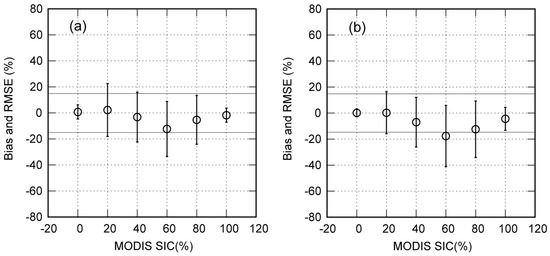 Root-mean-square error (RMSE) and bias (AMSR-E minus MODIS) of AMSR-E compared with those of MODIS in the entire (a) Northern and (b) Southern Hemispheres in 2006. MODIS SIC = 0, 20, 40, 60, 80, and 100% plot indicates the average RMSE and bias of MODIS SIC = 0%, 0% < SIC ≤ 30%, 30% < SIC ≤ 50%, 50% < SIC ≤ 70%, 70% < SIC ≤ 90%, and 90% < SIC ≤ 100%, respectively. The horizontal solid lines show −15% and 15% bias.