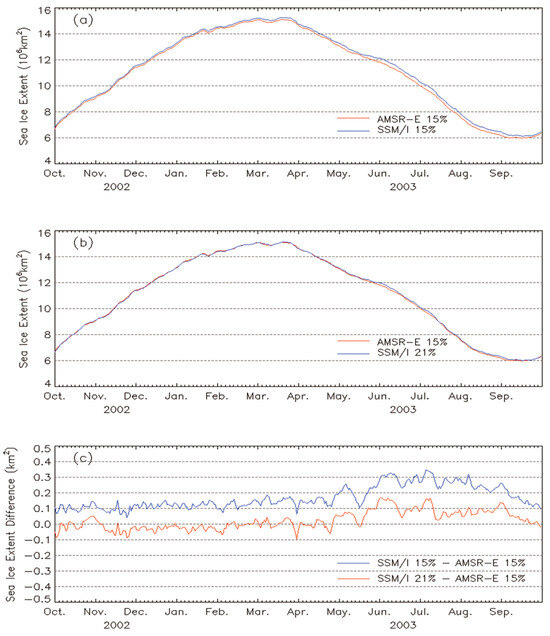 Figure 6 shows the SIE of SSM/I before (Figure 6a) and after (Figure 6b) the adjustment of the SIC threshold to estimate the continuous SIE trends. The effect of sea ice edge biases on SIE was slightly greater during summer than winter (Figure 6a). However, we confirmed that the sea ice edge bias was almost constant throughout the year, allowing the continuous monitoring of sea ice trends. The SSM/I SIC threshold was determined as the value that minimized the SIE difference between AMSR-E and SSM/I during a one year overlapping period (Figure 6b). Consequently, the mean SIE difference for AMSR-E and SSM/I decreased from 0.17 (km2) to 0.02 (km2) and the mean SIE standard deviation of the difference between AMSR-E and SSM/I changed from 0.07 (km2) to 0.06 (km2) by the adjustment.