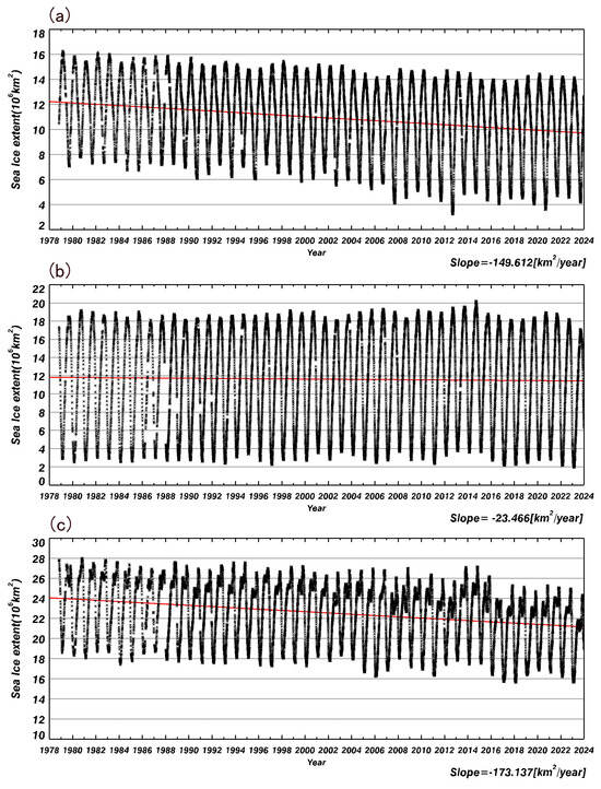 AMSR-E-based daily sea ice extent (12.5 km resolution) trends in (a) the Northern Hemisphere; (b) the Southern Hemisphere; and (c) both hemispheres for 45 years, i.e., from 1 November 1978, to 31 December 2023. The red lines are the sea ice extent trend per year.