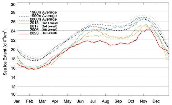 AMSR-E-based global yearly sea ice extent trends. The red, orange, green, and blue lines show the first, second, third, and fourth lowest SIE from November 1978 to December 2023, respectively. The first, second, third, and fourth lowest SIE were reached in 2023, 2018, 2017, and 2006, respectively. The lightest gray, light gray, and gray dotted lines show the average SIE in the 1980s, 1990s, and 2000s, respectively.