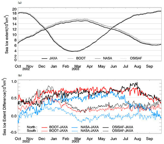 (a) Daily sea ice extent (SIE) trends of JAXA, OSISAF, BOOT, and NASA from October 2002 to September 2003 in the Northern Hemisphere (lines with increasing to decreasing curves) and Southern (lines with decreasing to increasing curves) Hemisphere. “JAXA” is the dataset in this study. “BOOT” is the Goddard bootstrap product at NSIDC (NSIDC-0192 in Table 2). “NASA” means NASA Team product (G0192 in Table 2). “OSISAF” is OSI-SAF (Bristol/Bootstrap) product (OSI-420 in Table 2) at EUMETSAT. The black solid line and lightest gray, light gray, and gray dotted lines show the SIE of JAXA, OSISAF, BOOT, and NASA, respectively. (b) Difference of daily sea ice extent among the JAXA, OSISAF, BOOT, and NASA in the Northern Hemisphere (solid line) and Southern Hemisphere (dashed line). The differences of BOOT–JAXA, NASA–JAXA, and OSISAF–JAXA are the red, blue, and black lines, respectively.