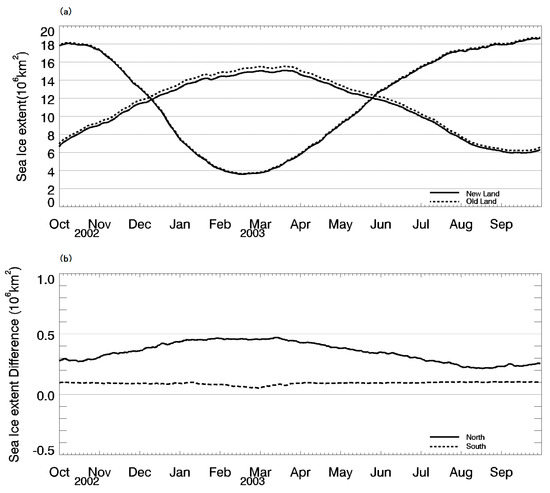 Conversely, several SIE datasets have been produced to reveal sea ice trends using SSM/I series data, as listed in Table 2 (e.g., Goddard Bootstrap, NASA team, and OSI-SAF, which were compared with our SIE datasets) [33,34]. These SIEs derived from SSM/I series were higher than that of our datasets (Figure 9). The resolution of AMSR-E is higher than that of SSM/I, and the sea ice edge of SSM/I is farther from the correct point than that of AMSR-E. Therefore, the SIE from the SSM/I series was higher than that of AMSR-E. Figure 10 shows the AMSR-E SIEs derived with the SSM/I-based land–ocean flag and those with the AMSR-E-based land–ocean flag. The similar feature shown in Figure 9 can also be observed in Figure 10, i.e., the use of the coarser land–ocean mask led to SIE overestimation. The SIE datasets derived from the SSM/I series used the land–ocean flag in a 25 km grid box based on the SSM/I map (hereafter referred to as “old land”). For the datasets derived from AMSR-E, SIC processing was performed before individual swaths were interpolated onto the grid; therefore, we used the land–ocean flag with the AMSR-E 18 GHz footprint size (hereafter referred to as “new land”). The new land mask reduced the misclassification of false sea ice pixels owing to higher resolution and improvements in the geometric precision of the AMSR-E sensor. Consequently, the SIE difference in winter was larger than that in summer. In the Antarctic Ocean, the AMSR-E SIE was similar for both cases using the new and old land masks (Figure 10). The effect of the land filter on the Antarctic was also small (Figure 11) because the coastlines are less detailed in the Antarctic. Regarding the effect of the land filter on the Arctic Ocean, the AMSR-E SIE decreased by 3.5–4.5% in summer and 1.5–2.5% in winter compared with the unfiltered cases (Figure 11). The Arctic SIE with the new land mask was 5.0–6.0% smaller than that with the old land mask (Figure 10). Therefore, the effect of the land filter was smaller than those of the land–ocean flag.
