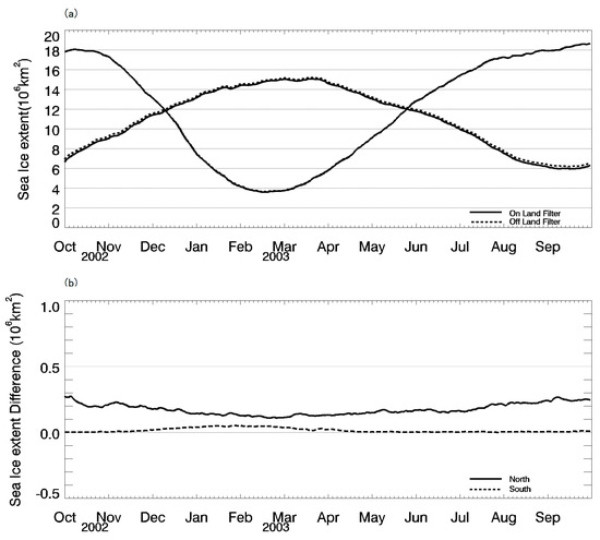 (a) Effect of land filter on the AMSR-E daily sea ice extent (SIE) trends from October 2002 to September 2003 in Northern (lines with increasing to decreasing curves) and Southern (lines with decreasing to increasing curves) Hemispheres. The solid line represents the SIE applied to the land filter, and the dashed line indicates the SIE of the no land filter. (b) Difference of applying land filter and no land filter in Northern (solid line) and Southern Hemispheres (dashed line).