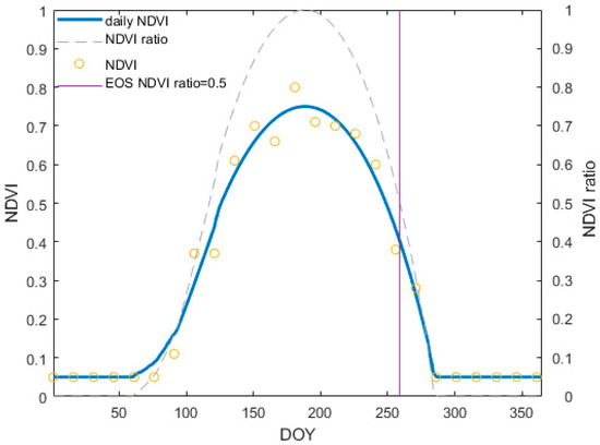 The EOS was obtained through the daily NDVI curve, and the EOS was determined as the day of the year when the decreased to 0.5 for the respective pixel (Figure 2). The was defined as follows: