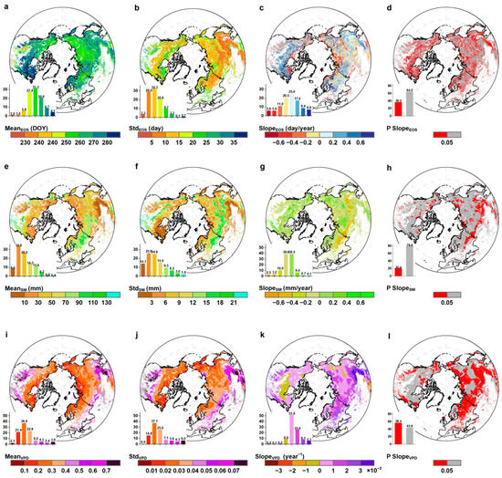 The EOS showed a postponing trend in most of the study area during the period, and an advancing trend was mainly found in high-latitude areas (Figure 3c). Some studies have shown that the EOS was mainly influenced by temperature and solar radiation with global warming [46,47,48].