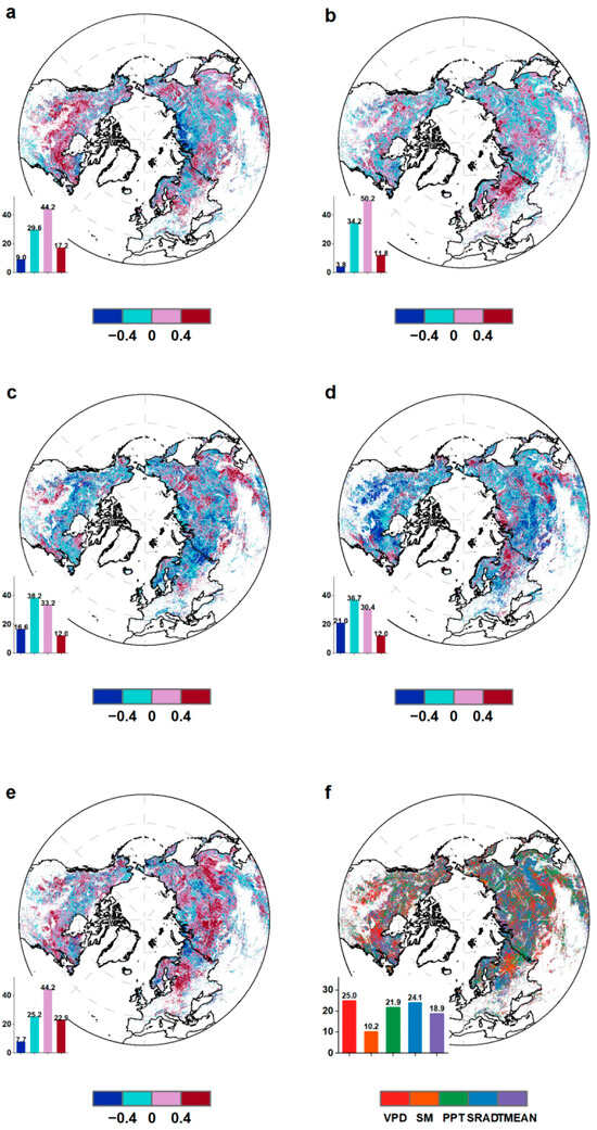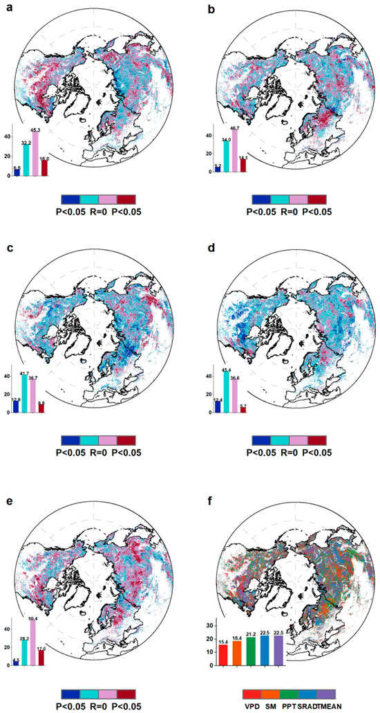 Spatial pattern of partial correlation coefficients between factors and EOS: (a) averaged temperature, (b) soil moisture, (c) precipitation, (d) vapor pressure deficit, (e) solar radiation, and (f) the most dominant factor. The gray areas represent non-significant pixels. The bars on the left express the proportions of the partial correlation coefficients between the EOS and corresponding factors.