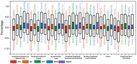 Partial correlation coefficients between the EOS and factors of each biome type. The bars above 0 represent percentages of positive correlations, and the others show negative percentages. Colored areas indicate significant percentages (p < 0.05).