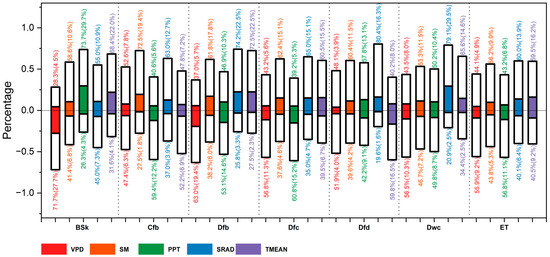 The partial correlation coefficients between the EOS and factors for different climate zones are shown in Figure 7. The influences of climatic controls on the EOS were obviously different among climate zones. That the temperature postponed the date of the EOS was obvious in most BSk and Dfb (more than 68% of pixels in these climate zones showed positive correlations). Precipitation was more important in BSk (positive in about 74%); however, the effects of solar radiation were obvious in Dfb, Dfc, Dfd, Dwc, and ET (more than 59% of pixels in these climate zones showed positive correlations). VPD played a critical role in BSk and Dfb (more than 63% of pixels in these climate zones showed negative correlations). SM played a critical role in Cfb (positive in about 72%).