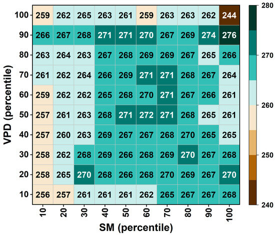 VPD and SM were typically strongly coupled in both their temporal and spatial distributions, leading to ambiguity in determining their individual effects on EOS. To disentangle these effects, we first calculated threshold values corresponding to the 10th, 20th, …, and 90th percentiles of the sorted VPD and SM for each pixel in the study area, which were then used to categorize the EOS values into bins. The VPD and SM data were divided into 10 bins based on the aforementioned thresholds, representing the 0–10th, 10–20th, …, 80–90th, and 90–100th percentiles of VPD or SM [22,42,43]. Subsequently, the EOS values within each SM bin were sorted based on VPD thresholds, and vice versa, resulting in a total of 100 bins (10 bins for VPD and 10 bins for SM). We then computed the mean EOS for the pixels corresponding to each of these bins, yielding 100 average EOS values across the different percentiles of VPD and SM. This approach allowed us to independently assess the changes in EOS with respect to VPD or SM, without interference from the other variable.