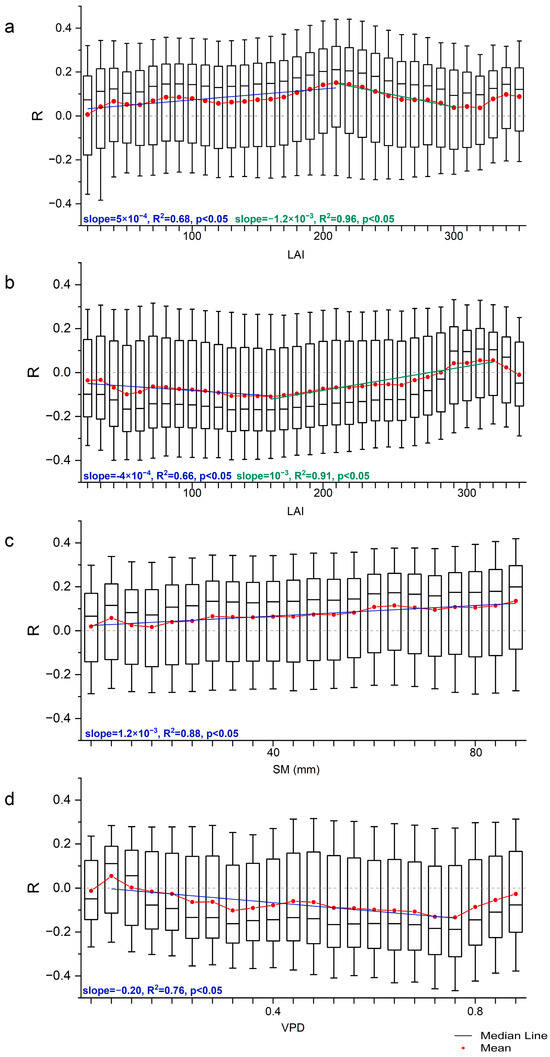 The correlations between the coefficients of partial correlation between EOS and SM (a,c), VPD (b,d), and the variables (LAI, LAI, SM, and VPD), respectively.