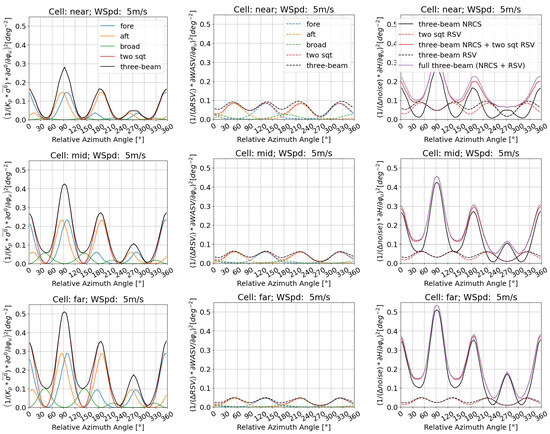Table 2), hence obtaining better NRCS sensitivity to wind direction. We do not explain yet fully why the two-azimuth configuration (2base, black dotted line) performs better than the baseline (3base_RSVnan, black solid line) at very-near range [−50 km, −20 km] given that there is no broadside data and the squinted beams have the same incidence and azimuth angles as the baseline configuration. One hypothesis is that the retrieval has some non-linearities at the very-near range.