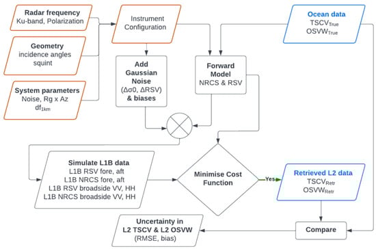 The inversion seeks to identify the wind and current vectors (OSVW, TSCV) that are most consistent with the Level-1 observables measured by the instrument: the Normalised Radar Cross Section (NRCS) also known as , and Radial Surface Velocity (RSV) in all available azimuth directions. We designate the state vector to represent OSVW and TSCV, and the observation vector to represent the L1 observables.