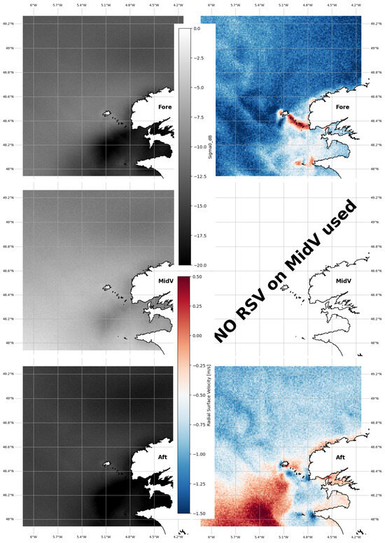 Figure 7-left) correctly show reduced backscatter in the area of low wind speeds south of Ouessant Island (around 48.2°N-5.1°W). NRCS from the broadside beam (MidV,