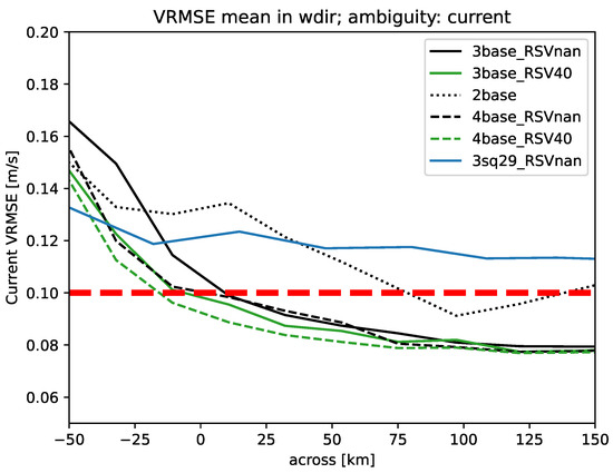 Compared to the baseline (3base_RSVnan, black solid line), the addition of broadside (4base_RSVnan, black dashed line) leads to small RMSE improvements at near range (reduction of ∼0.01 m/s at 0 km, ∼0.03 m/s at −30 km) and only marginal improvements at ranges above 10 km (<0.01 m/s). In these simulations, the performance improvement observed by adding broadside HH backscatter capability (, 4base_RSVnan, black dashed line) is similar to the improvements obtained by adding broadside VV RSV capability (, 3base_RSV40, green solid line). The further addition of broadside (4base_RSV40, green dashed line) leads to only marginal further improvements across the swath (<0.01 m/s).