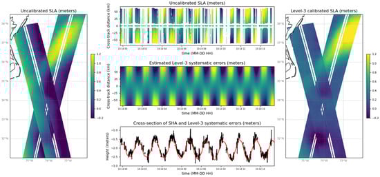 The uncalibrated error analysis shown in Section 2 was essential to validate the use of the calibration algorithms designed during the pre-launch studies [,]. Indeed, below 1000 km, the systematic errors are fairly below the requirements, so the calibration does not need to operate at these wavelengths, as expected. This is where the calibration would have been particularly challenging, with risks of absorbing natural ocean variability []. Therefore, in this band, there is no need to update any algorithm.