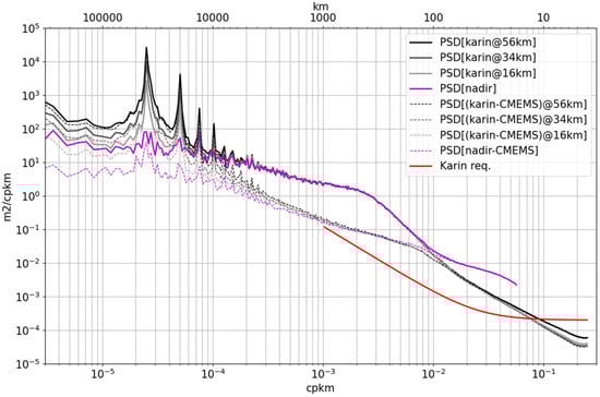 The first striking feature is indeed the presence of a strong orbital signal of energy growing with the cross-track distance (gray to black lines), which is consistent with the roll-shape identified earlier. The orbital peak, near 40,000 km in wavelength, is not a pure harmonic, as indicated by the succession of secondary peaks at a multiple of the orbital frequency. Beyond these orbital peaks of low-frequency, we can note an exceptional match in energy below 3000 km between Karin and the Nadir altimeter, down to nearly 100 km, where the nadir altimeter noise starts to impact the spectral energy as expected. The use of the CMEMS multi-altimeter gridded topography [] (not including SWOT) as a prior field to subtract is interesting in highlighting the innovation signal seen by SWOT on top of what is already known. The spectra of these signals are shown as dashed in Figure 2. The match between Karin and nadir is still very good between 1000 km and 100 km, while the increase in Karin energy starts to be detectable above 1000 km.