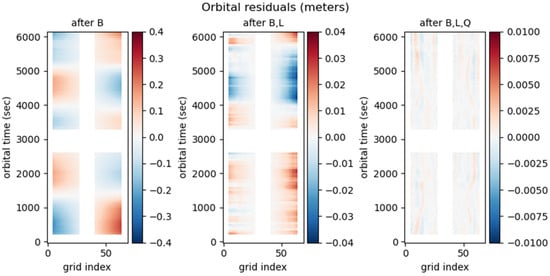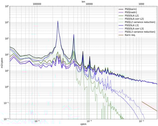 At Level-3, the so-called ‘Direct’ method from [] has been implemented, formerly based on the CMEMS Time-delayed Level-4 multi-altimeter product. As mentioned in [], a key aspect of this algorithm is the proper dynamic filter cutoff to separate the Karin ocean variability (expected to be above the short-scales that are not resolved by the CMEMS maps, but below the large scales where the systematic errors dominate). The direct spectral analysis presented in Section 2.1, in comparison with the cross-spectral analysis in Section 2.2, suggests that the geophysical variability impacts the polynomial fit from the shortest scales, up to about 3000 km wavelength (the plateau for ‘L’ and ‘B’ on Figure 2). This value may appear important, since the CMEMS maps are supposed to be accurate at these large wavelengths [] and therefore suppress the remaining ocean variability seen by Karin. However, here, we are aiming at tackling very small systematic errors (below original requirements) and, therefore, even small errors in the CMEMS maps may have an impact on the separation. Therefore, we chose to keep this 3000 km cutoff for L and B dynamic filtering, to mitigate geophysical contamination. For the minor error terms (aB, aL, Q and aQ), the direct spectral analysis in Figure 3 does not suggest the presence of any clear broadband error spectrum. Therefore, only the orbital fit is implemented for these terms, without any dynamic filtering, to further mitigate potential leakages. The orbital fits for all terms (also including L and B) have been updated from [] to better capture the secondary peaks. The first four harmonics are fitted over a 1.5 orbit time sliding window centered on each pass sequentially.