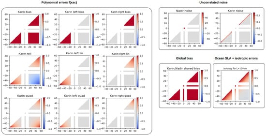 Illustration of the different projection models for the systematic errors on the left (denominated as polynomial errors), for the uncorrelated noise (top right), for the global bias (shared by the nadir and Karin altimeters) and for all isotropic terms, on the lower-right.
