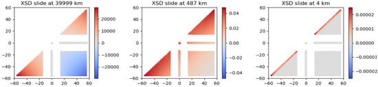 The Cross-Spectral Density (XSD) slice computed and averaged over the whole dataset, for three different wavelengths: 40,000 km, 487 km and 4 km.