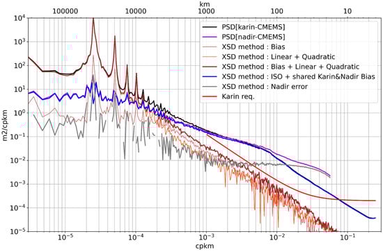 To further validate these results, we performed an additional analysis presented in Appendix A. Based on the spectral energy increase across the swath, the analysis validates the consistency of the spectrum for the linear (L + aL) and quadratic (Q + aQ) terms. This analysis cannot apply to the Bias term (not separated from the Oceanic variability). However, the spectrum for the Bias is consistent with the Karin/Nadir analysis detailed in [], also suggesting a −2 spectrum slope below the requirement curve. These consistent results give further confidence in the XSD analysis, suggesting that the systematic error spectrum is well below the requirements at all scales.