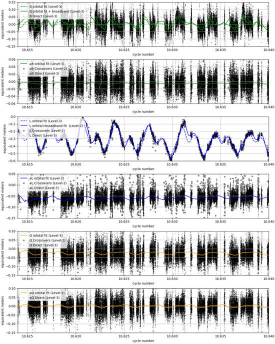 Before the fit, the noise that dominates the estimations of all terms except ‘L’ is attributed to the geophysical variability (or additional errors) and is therefore not captured by the low-frequency fit. This noise is also similarly present for L, but somehow masked by the orbital signal of nearly 30 cm amplitude on the figure. For the minor terms (aB, aL, Q and aQ), we confirm that there is no clear apparent signal to fit beyond the orbital harmonics, as suggested by the direct spectral analysis.