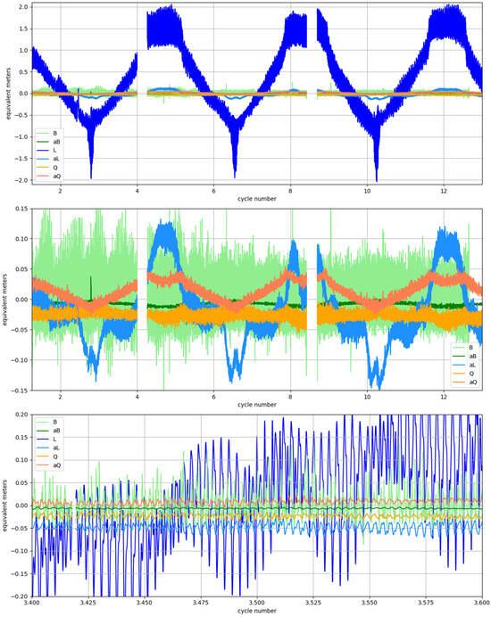 From the decomposition, the time series of each term of the vector  can be processed in power spectral density with the same processing as described for the spectral analysis of Figure 2 (also along 14-orbit segments to allow good resolution near the orbital frequency). For an easy comparison of the relative magnitude of the terms, the spectra have been scaled to the equivalent contribution in averaged energy over the 10–60 km off nadir band. These spectra are shown on Figure 3, with the spectrum of the total SLA in black. On the right-hand side, for wavelengths shorter than 3000 km, we suspect that the plateaux are the effect of the geophysical signals on the polynomial decomposition, and this will be confirmed later. However, for long wavelengths, the energy can be reasonably attributed to the systematic errors (or at least to an upper bound). The L term clearly dominates above 10,000 km, explaining the main orbital peaks of the total signal. It also features a broadband spectrum clearly visible between 20,000 km and 3000 km with a minus 2 decay law, which may prolongate toward shorter wavelengths below the dominant geophysical contribution. This −2 slope was expected from the gyroscope residual error contribution []. The B term, which has been calculated relative to the SWOT Nadir Altimeter SLA, is also an important contributor with clear spectral peaks (the secondary peak being larger than the primary). A broadband spectrum is also suspected, as discussed later. Beyond these two main contributors, the levels of the other terms are low, mostly composed of orbital harmonics. The integrated values in centimeters will be given and discussed in the next section.