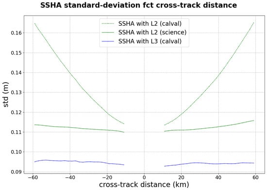 Standard deviation (in meters) of the calibrated signal as a function of the cross-track distance, averaged over the global ocean surfaces.