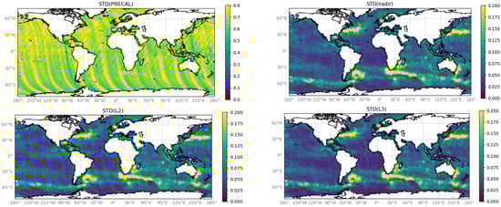 Standard deviation (in meters) of the uncalibrated Karin SLA (upper left), of the SWOT nadir SLA (upper right), of the Level-2 calibrated Karin SLA (lower left) and of the Level-3 calibrated Karin SLA (lower right).